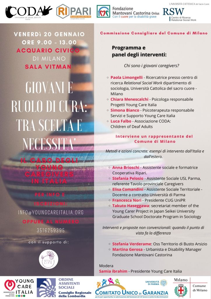 Il convegno “GIOVANI E RUOLO DI CURA: TRA SCELTA E NECESSITA’. IL CASO DEGLI YOUNG CAREGIVERS IN ITALIA.” è un’occasione per approfondire il tema dei Giovani Caregivers dal punto di vista sociologico, psicologico, legale e dell’intervento territoriale, grazie all’intervento di esponenti accademici, professionisti esperti nell’ambito, testimoni esperti per esperienza e rappresentanti di associazioni nazionali e internazionali.